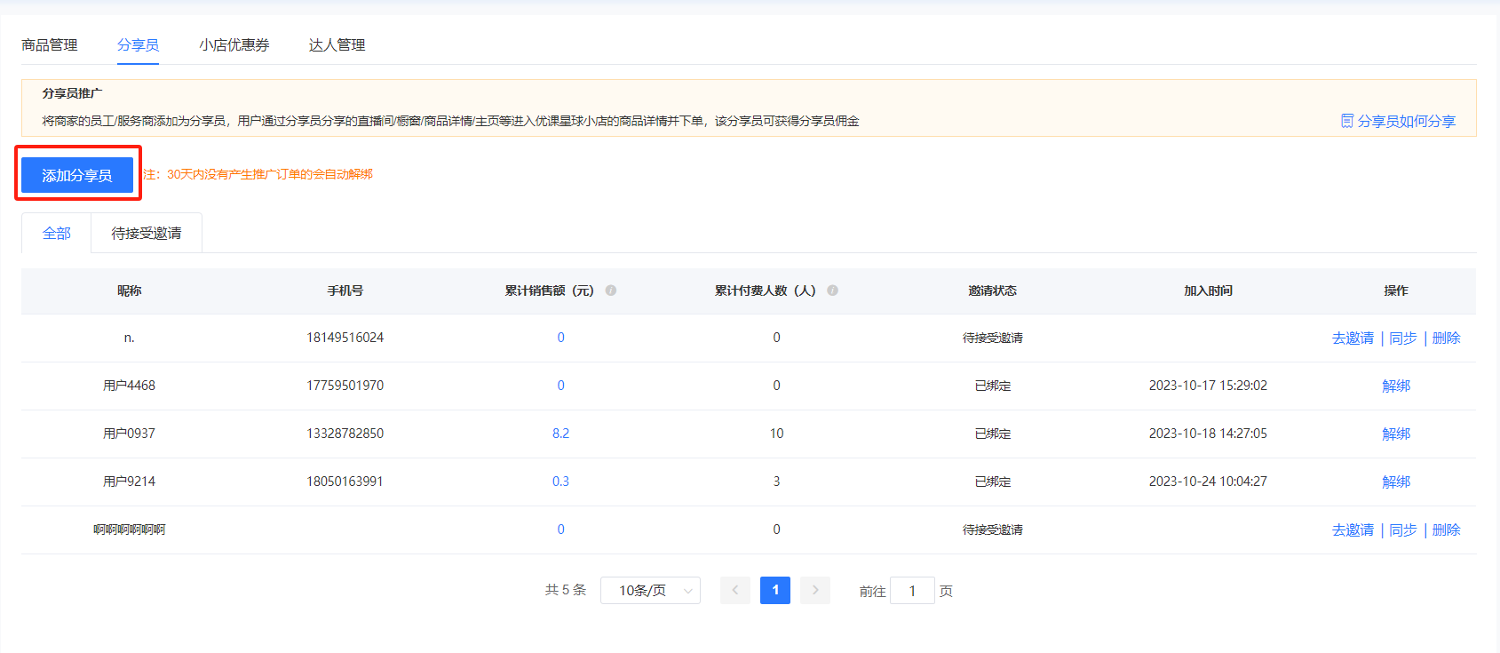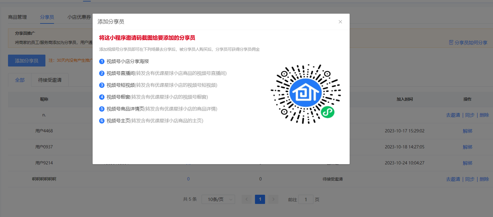 分享员分享只需商家邀请用户成为分享员,分享员即可在相关场景分享商家视频号商品;(门槛更低)