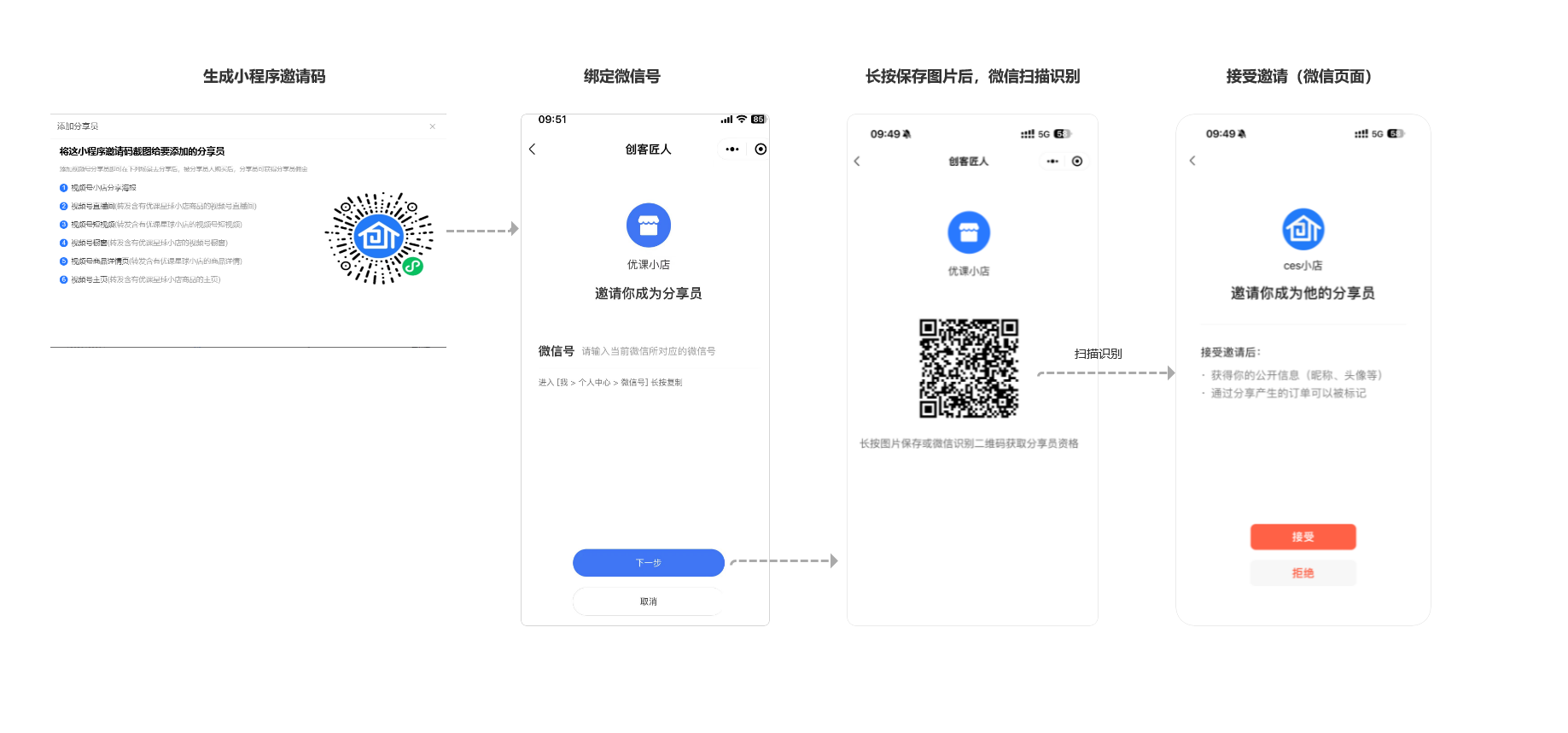 扫描后生成小程序邀请码-----发给要邀请的用户----该用户扫描后去绑定该微信号,----生成邀请二维码----长按保存图片后,用微信扫描识别后接受邀请后----后台手动点同步