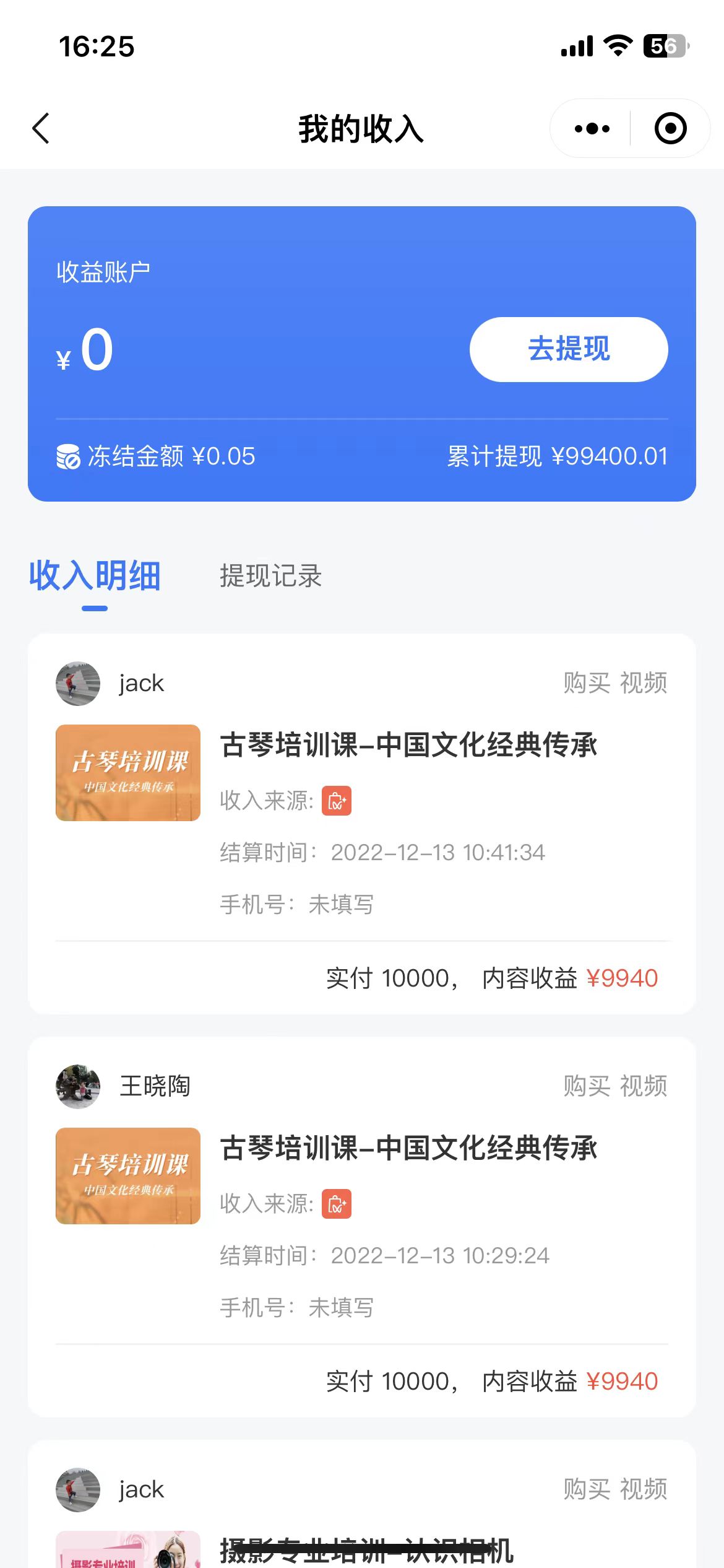 分享员进入优课星球精选小程序-我的收入,查看收益、订单详情并提现;